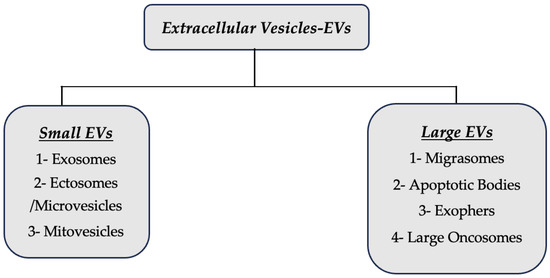 Generally, a simple classification has been made according to release mechanisms and size. Studies to be carried out in the coming years will allow this classification to be updated. According to the minimal information for studies of extracellular vesicles (MISEV2023) guide published by the International Society for Extracellular Vesicles (ISEV) in 2024, the use of EVs subtypes continues to be carefully encouraged if they are differentiated according to properties such as size, density, molecular composition [13]. As studies continue for EV subclasses, new information is being obtained. EVs are recognised as a heterogeneous population of vesicles that vary in size, biological function, and origin. Published in 2024 and available on the Vesiclepedia website (http://www.microvesicles.org, accessed on 27 March 2024), the recognized types of EVs are roughly divided into small EVs and large EVs. An additional subtype, extracellular particles other than EVs (EPs), is also included in the classification of EVs. The classical classification includes exosomes (<200 nm), microvesicles (<1000 nm) and apoptotic vesicles (<5000 nm). Increasing studies on EVs have paved the way for discovering their new subtypes. The newly added subtypes, thanks to those studies are mitovesicles (<1000 nm), migrasomes (3000 nm), and exophers (<4000 nm) oncosomes (<1000 nm), megavesicles-large oncosomes (10,000 nm) [13,14,15,16,17,18,19,20,21]. EVs subtypes are shown in Figure 1 and Figure 2 below.