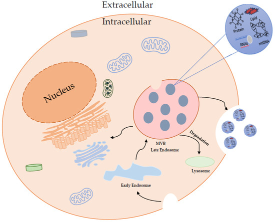 Exosomes are bioactive vesicles secreted by cells, ranging in size from 40 to 200 nm, and taking an active role in intercellular cargo and communication, constituting the important subgroup of EVs. Exosomes are formed due to endosome differentiation [39,40]. Their nanoscale components play a sophisticated role in mRNA regulation and are associated with many physiological and pathological functions [41]. Subsequent studies have shown that exosomes function as a cell-to-cell communication mediator. They can easily interact with neighbouring cells to facilitate the transfer of active molecules [42,43]. Exosomes are made up of specially ordered proteins, lipids, and nucleic acids, depending on their cell type. It has been observed that approximately 4400 different proteins, 194 different lipids, 1639 different mRNAs, and 764 different miRNAs can be found in isolated exosomes of different origins to date. This shows that exosomes may have different contents from the cells they originate from. Specific components from different cell types can also be identified. These different components reveal the exosome’s complex structure and potential functional diversity [43,44].