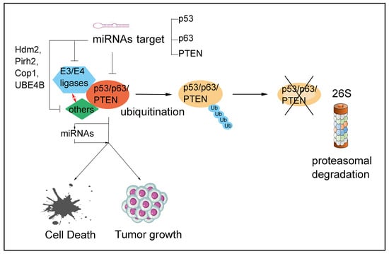 Illustrates how miRNAs regulate tumor suppressors’ expression or activity. They can also affect their stability and activity by targeting an E3 ligase, thus influencing cell proliferation and cancer progression. Moreover, miRNAs can promote cell death. The figure provides a summary of tumor suppressors that are regulated by miRNAs.