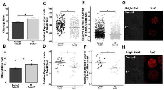 Effect of FF treatment on early embryonic development and 5mC expression levels in embryos. Presumptive zygotes (18 h post-insemination) were cultured with 0% (control) or 1% FF for 30 h, and the cleavage rate of 8-cell-stage embryos (A) and blastulation rate (B) were determined. Relative expression levels of 5mC in 8-cell-stage embryos ((C): blastomere; (D): whole embryos) and blastocysts ((E): blastomere; (F): whole embryos) were determined using immunostaining. (G,H): Representative images of 5mC in 8-cell-stage embryos (G) and blastocysts (H). “No.” indicates the number of samples used. Data are presented as mean ± SEM; * p < 0.05. Mann–Whitney U test was used for comparison between two groups.