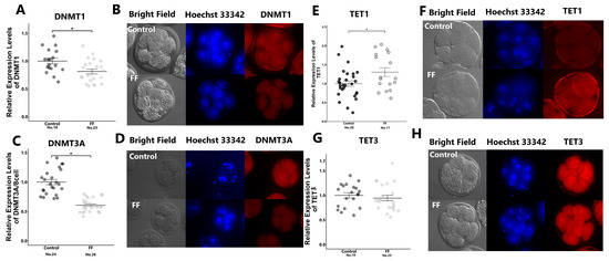 Effect of FF treatment on expression levels of methyltransferases and demethylase in 8-cell-stage embryos. Presumptive zygotes (18 h post-insemination) were cultured with 0% (control) or 1% FF for 30 h, and relative expression levels of DNMT1 (A), DNMT3A (C), TET1 (E), and TET3 (G) were determined using immunostaining. (B,D,F,H): Representative images of DNMT1 (B), DNMT3A (D), TET1 (F), and TET3 (H) in 8-cell-stage embryos. “No.” indicates the number of samples used. Data are presented as mean ± SEM; * p < 0.05. Mann–Whitney U test was used for comparison between two groups.