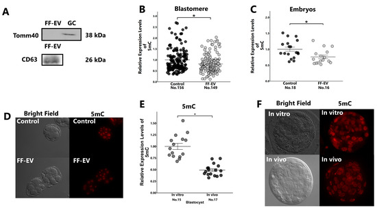 Western blotting of EVs and GCs, and comparison of 5mC expression between EV treated and untreated embryos, or between in vivo- and in vitro-developed blastocysts. (A): Protein levels of CD63 and Tomm 40 in EVs and GCs. Presumptive zygotes (18 h post-insemination) were cultured with or without EVs for 30 h, and the expression levels of 5mC in 8-cell-stage embryos ((B): blastomere; (C): embryos) were examined using immunostaining. In addition, the expression levels of 5mC in blastocysts collected from super-ovulated cows (in vivo) or in vitro-developed blastocysts (in vitro) were examined using immunostaining (E). (D,F): Representative images of 8-cell-stage embryos (D) and blastocysts (F). “No.” indicates number of samples used. Data are presented as mean ± SEM; * p < 0.05. Mann–Whitney U test was used for comparison between two groups.
