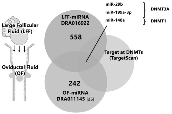 Schematic design for the selection of candidate miRNAs in FF. The miRNAs in EVs derived from large FF (LFF, >10 mm in diameter) were subjected to small RNA-seq and 558 miRNAs were detected (DRA016922). The miRNAs in LFF were compared with the 242 miRNAs in EVs of OF (DRA011145 [25]), and miRNAs targeting DNMTs (in silico prediction using TargetScan, http://www.targetscan.org (accessed on 19 May 2024)).