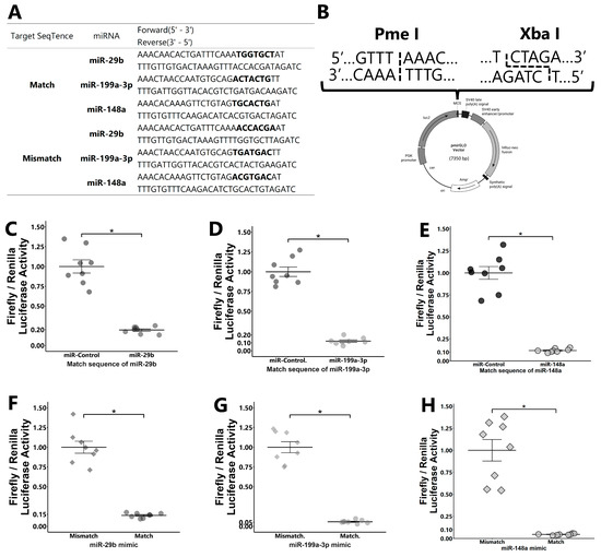 Dual luciferase reporter assay. pmirGLO vectors with oligonucleotides having match or mismatch target sequences of miRNAs (A) inserted into PmeI and XbaI sites in the multi-cloning site (B) were used. GCs were transfected with the pmirGLO vector with a matched target sequence of miRNAs and then co-transfected with miRNAs ((C): miR-29b; (D): miR-199a-3p; and (E): miR-148a) or control mimic. The expression value for the control was defined as 1.0. GCs were transfected with the pmirGLO vector with matched or mismatched target sequences and then co-transfected with miRNA mimics ((F): miR-29b; (G): miR-199a-3p; and (H): miR-148a). The average value of mismatch was defined as 1.0. Each experiment consisted of 8 replicates. Data are presented as mean ± SEM; * p < 0.05. Student’s t-test was used for comparison between two groups.
