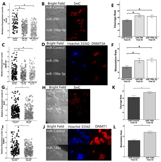 The transfection of the embryos with miR-29, -199a-3p, and -148b mimics reduced the expression levels of global 5mC and improved the blastulation rate. Furthermore, these miRNAs reduced the protein levels of targeting DNMTs (Figure 7A–L).