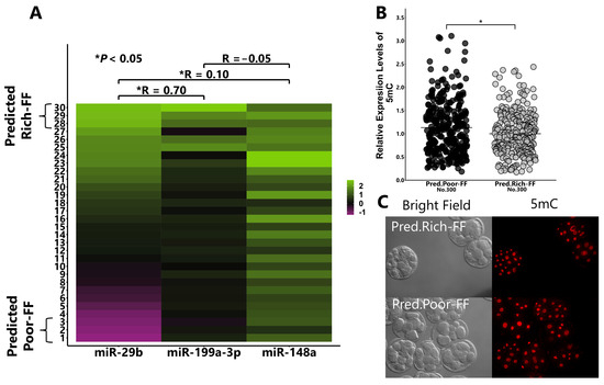 Effect of Predicted Rich-FF or Predicted Poor-FF treatments on the expression levels of 8-cell-stage embryo. Correlation among the contents of miR-29b, -199a-3p, and -148a in the FF of 30 cows (A). Based on the contents of miR-29b and -199a-3p in the FF, the top 3 and bottom 3 FFs were defined as Predicted Rich-FF and Predicted Poor-FF, respectively. Presumptive zygotes (18 h post-insemination) were cultured with Predicted Rich-FF or Poor-FF for 30 h, and the expression levels of 5mC in 8-cell-stage embryos were measured using immunostaining (B). (C): Representative image of 5mC. “No.” indicates number of samples used. Data are presented as mean ± SEM, * p < 0.05. the Mann–Whitney U test was used for comparison between two groups.