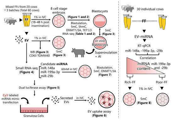 Schematic design of experiments and the respective results. FF of 20 cows was mixed and added to IVC medium (1%) 18–48 h post-insemination, and then the blastulation rate, levels of 5mC, 5hmC, DNMTs, and TETs were examined. The 8-cell-stage embryos were subjected to RNA-seq. Data are presented in Figure 1 and Figure 2 and Table 1 and Table 2. Subsequently, EVs were extracted from the FF; contents of CD63 and TOMM40 in the EVs were examined (Figure 3). The effect of the addition of EVs to the culture medium on the expression levels of 5mC was examined. The levels of 5mC in blastocysts developed in vitro (control) was compared with those of blastocysts developed in vivo (Figure 3). Using small RNA-seq and previous small RNA-seq data, candidate miRNAs were predicted (Figure 4). The dual luciferase assay was used to determine if the miRNA mimic actually targeted the predicted sequence in bovine GCs (Figure 5). The GCs were transfected with miRNA mimics labeled with Cy3. EVs were collected from the culture medium and were then added to the culture medium of embryos to see if the EVs containing miRNAs were taken up by the embryos (Figure 6). The effect of the supplementation of the embryo culture medium with the candidate miRNAs (miR-29b, -199a-3p, and -148a) on the expression of targeted DNMTs was examined. The hypothesis that FF contains miR-29b, -199a-3p, and -148a, which have a strong ability to demethylate DNA in embryos, was tested using FF collected from 30 individual cows (Figure 8).