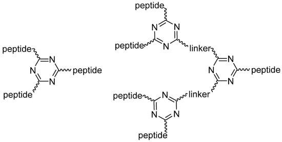 For the efficient application of this scheme, two factors should be considered. First, the synthesis of these macromolecules is not straightforward because the introduction of each branching unit doubles the capacity of the resin, favors interchain interaction and jeopardizes the continuous growth of the peptide chain. In other words, the branching unit brings about “congestion” of the resin. Second, when 1,3,5-triazine is used as a branching unit, it is important to control the three substitutions on its TCT precursor as the first substitution is usually performed at 0 °C, the second at room temperature (rt) and the third at >50 °C [25]