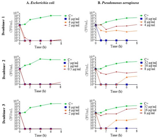 To determine the pharmacodynamics of the dendrimers, their death kinetics were examined by plotting time-kill curves. Regarding the results in E. coli ATCC 25922, at sub-inhibitory concentrations, the dendrimers killed all the bacteria in less than 1 h; that is to say, they act as a bactericide. After 6 h, eventually, some re-growth occurred, demonstrating a certain degree of bacterial survival (Figure 3A). In the case of P. aeruginosa ATCC 27853, the three dendrimers killed bacteria in a concentration-dependent manner. At MIC, complete eradication of bacteria was achieved in less than 1 h for all three dendrimers. Furthermore, at ½ MIC, dendrimers 2 and 3 showed higher antimicrobial activity than dendrimer 1 (Figure 3B).
