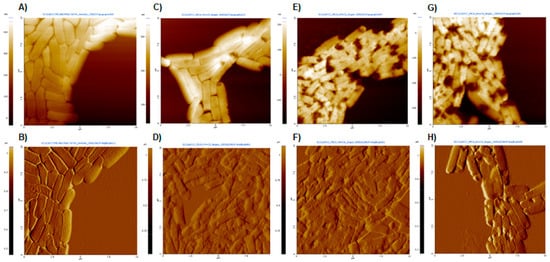 AFM images obtained at a scan size of 100 μm2. (A,C,E,G) Topography images and (B,D,F,H) amplitude images. (A,B) Untreated E. coli; (C,D) E. coli after treatment with dendrimer 1 at MIC (8 µg/mL); (E,F) E. coli after treatment with dendrimer 2 at MIC (2 µg/mL); (G,H) E. coli after treatment with dendrimer 3 at MIC (8 µg/mL).