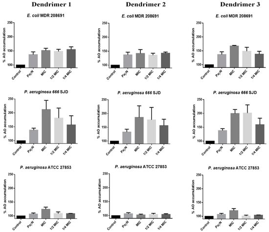 Percentage of Acridine Orange (AO) accumulation with dendrimers 1, 2 and 3. The control represents the assay with bacteria and AO. Assays were performed in E. coli 208691, P. aeruginosa 666 SJD and P. aeruginosa ATCC 27853.