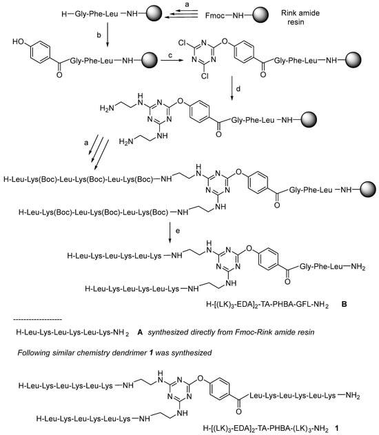 All the peptides in this study were synthesized as C-terminal amides using a fluorenylmethoxycarbonyl (Fmoc)/tert-butyl (tBu) protection scheme on a Fmoc-RinkAmide-resin and N,N’-diisopropylcarbodiimde (DIC)/2-cyano-2-(hydroxyimino)acetate (OxymaPure) as the coupling method [29]. To test the feasibility of our proposal, first of all, the tripeptide (Gly-Phe-Leu) was first incorporated to separate the resin from the growing molecule. Next, the p-hydroxybenzoic acid (PHBA) was incorporated directly into the N-terminal of the Gly residue without phenol protection which could lead to double or even triple incorporation of the PHBA unit. To prevent the possible extra attached PHBA units, the peptidyl-resin was treated with a solution of 20% v/v piperidine in DMF (the same solution as that used to remove the Fmoc group) to hydrolyze the possible phenyl ester formed. After checking the successful incorporation of a single PHBA moiety, the triazine was introduced in the presence of DIEA at −20 °C for 1 h. Ethylenediamine (EDA) was then added in excess in the presence of DIEA at rt for 12 h. Finally, two copies of [Leu-Lys(Boc)]3 were built up on the construct to render a first-generation (G1) dendrimer H-[(LK)3-EDA]2-TA-PHBA-GFL-NH2 (B). Scheme 1 shows the conditions used for the synthesis of B.