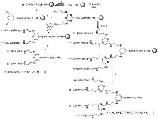 As peripheral moieties of our dendrimers, and based on previous reports [19,20,21,22], we chose a short peptide based on the repetitive alternance of two residues, one hydrophobic, Leu, and one cationic, Lys. Peptides based on this kind of sequences have been previously studied as antimicrobial agents and were found to be interesting because of their ability to form β-stranded structures when they bound to membranes that can result in oligomeric β-sheets or long amyloid-like cross-β-sheet fibrils. Moreover, in general, the hemolysis shown by this kind of compound is low [23,24]. Thus, H-Leu-Lys-Leu-Lys-Leu-Lys-NH2 [H-(LK)3-NH2] (A) was chosen as the number of Leu-Lys repetitions to be installed in each branch. Herein, we explored the use of 1,3,5-triazine on SPPS to build up dendrimeric peptides and study their antimicrobial activity as well as gain some insights into their mechanisms of action.