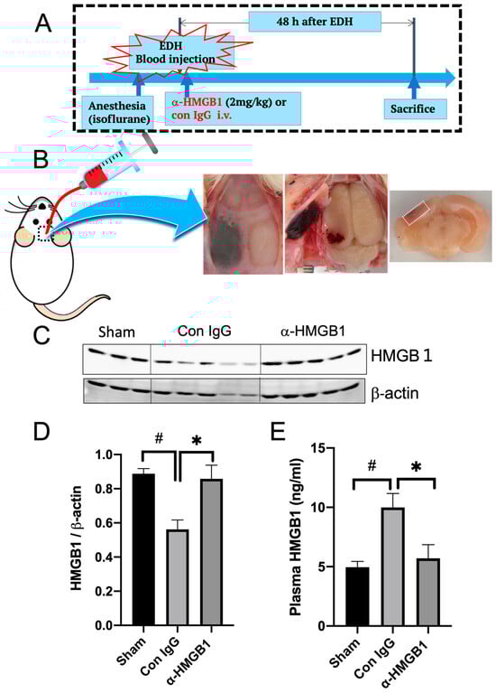 Experimental protocol and changes in HMGB1 levels in the brain and plasma 48 h after the EDH. (A) Experimental protocol of the EDH. (B) Typical appearance picture of the EDH. The brain samples were collected 48 h after the induction of the EDH from the dotted area in (B) and were used for western blotting for HMGB1. (C) The representative results of western blotting are shown. A decrease in HMGB1 levels in the ipsilateral cortex (peri-hematoma) in the control IgG group is shown. (D) Quantitative analyses of western blotting results were performed using NIH Image J software V.1.53, and the results are expressed as mean ± SE of 3–5 rats per group. Differences were considered significant at # p < 0.05 compared to the sham group. * p < 0.05 compared to the control IgG-treated group. (E) Plasma levels of HMGB1 in rats with an EDH were determined by ELISA. Blood samples were collected 48 h after the induction of hemorrhage. The results are expressed as mean ± SE of 3–5 rats per group. # p < 0.05 compared to the sham group. * p < 0.05 compared to the control IgG-treated group.