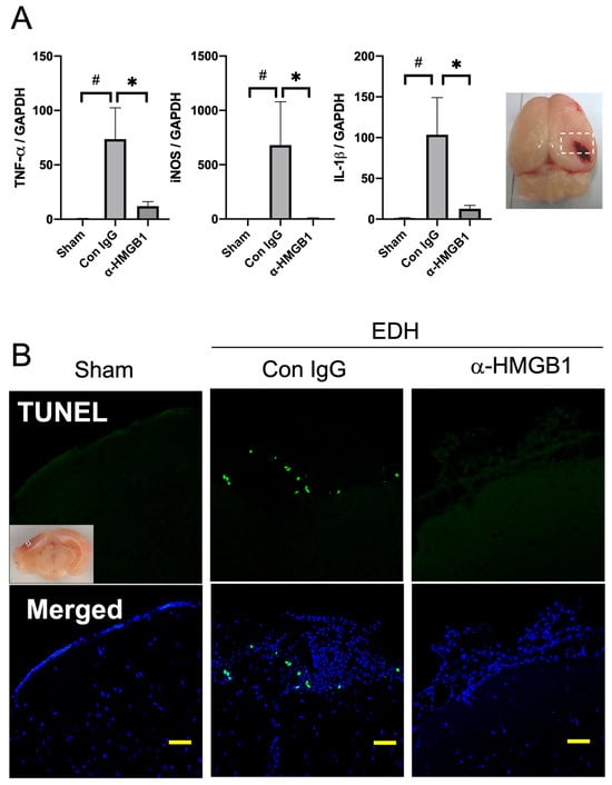 Effects of the anti-HMGB1 mAb on the expression of inflammation-related molecules and apoptosis 48 h after the EDH. (A) The mRNA expression of TNF-α, iNOS, and IL-1β was measured by quantitative real-time polymerase chain reaction in the cerebral cortex (peri-hematoma) 48 h after the EDH. The primer information refers to previous research []. The results are expressed as mean ± SE of 5 rats (A). # p < 0.05 compared to the sham group. * p < 0.05 and compared to the control IgG-treated group. (B) TUNEL staining was performed to reveal apoptotic cells in the ipsilateral cerebral cortex in each group. Scale bar: 50 μm.
