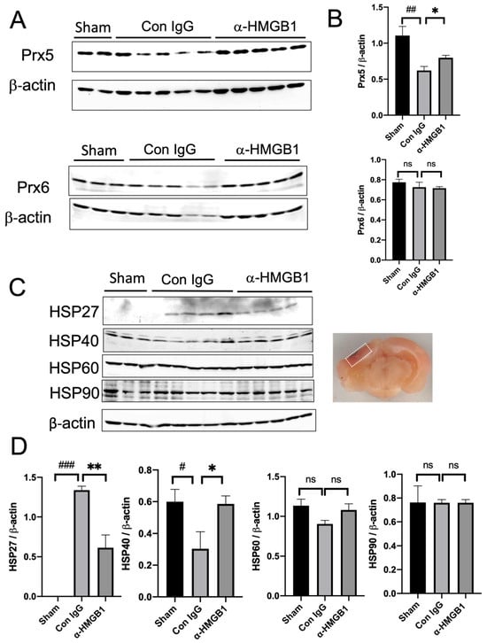 Changes in the brain levels of Prxs and heat shock proteins (HSPs) in the brain after the EDH. (A) Prx5 and Prx6 levels in the ipsilateral cerebral cortex (beneath hematoma) were determined 48 h after the EDH by western blotting. (B) The representative results of western blotting are shown. β-actin was used as a reference. Quantitative analyses on western blotting results were performed using NIH Image J software. The results are expressed as mean ± SE of 3–5 rats. ## p < 0.01 compared to the sham group. * p < 0.05 compared to the control IgG-treated group. ns means no significant difference. (C) HSP levels (HSP27, HSP40, HSP60, and HSP90) were determined by western blotting in the ipsilateral cortex (beneath hematoma) 48 h after the EDH. The representative results of western blotting are shown. (D) Quantitative analyses on western blotting results were performed using NIH Image J software. The results are expressed as mean ± SE of 3–5 rats. ### p < 0.001 and # p < 0.05 compared to the sham group. ** p < 0.01 and * p < 0.05 compared to the control IgG-treated group. ns means no significant difference.