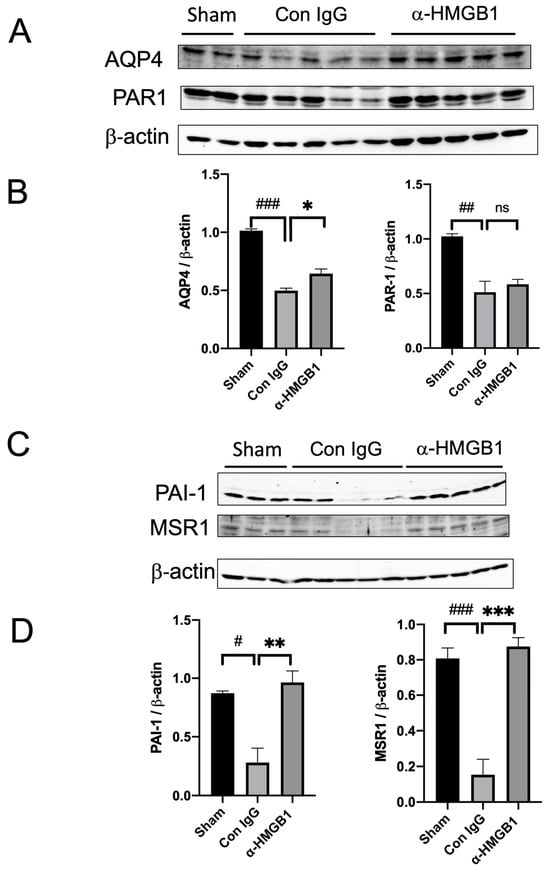Following the EDH, the levels of aquaporin-4 (AQP4), a key water channel protein involved in brain edema, and thrombin receptor PAR-1, which is implicated in coagulation and inflammation, were both reduced by 50%. Anti-HMGB1 treatment partially reversed the decrease in AQP4 levels, suggesting its potential role in mitigating brain edema, but did not significantly affect the reduction in PAR-1 levels (Figure 4A,B). Additionally, the protein levels of plasminogen activator inhibitor-1 (PAI-1), a regulator of fibrinolysis, and macrophage scavenger receptor 1 (MSR1), which is involved in the clearance of cellular debris, were markedly suppressed 48 h after the EDH. Anti-HMGB1 treatment completely reversed the suppression of PAI-1 and MSR1, indicating its efficacy in restoring these proteins’ expression and potentially enhancing the brain’s recovery process (Figure 4C,D)