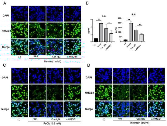 SH-SY5Y cells pretreated with 10 ug/mL of the anti-HMGB1 mAb or Control IgG for 1 h (h) before being stimulated with hemin (51280, Sigma, Tokyo, Japan) (1 mM), FeCl2 (372870, Sigma, Tokyo, Japan) (0.6 mM), or thrombin (B352, Mochida, Tokyo, Japan) (5 U/mL). Then, 24 h after stimulation, the cells were fixed with 4% paraformaldehyde and blocked with 10% bovine serum albumin (BSA). Afterward, the cells were stained by the anti-HMGB1 Ab (ab18256, Sigma, Tokyo, Japan) for 1 h at 37 °C, followed by Alexa Fluor 488-labeled anti-rabbit IgG. The cell nuclei were stained with DAPI for 5 min and then observed using a confocal microscope (LSM 780, ZEISS, Oberkochen, Germany). The EA.hy 926 cells were prepared as described previously []. The EA.hy 926 cells were also pretreated with 10 ug/mL of the anti-HMGB1 mAb or control IgG for 30 min before being stimulated with Tumor Necrosis Factor-alpha (TNF-α) (H8916, Sigma, Tokyo, Japan) (100 ng/mL) for 6 h. The immunostaining for HMGB1 was conducted as described above.