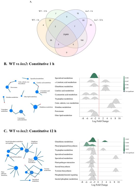 Foliar constitutive gene expression. (A): Venn diagram of constitutive genes differentially expressed between wildtype (WT) and lox2 Arabidopsis thaliana plants at two time points (1 and 12 h). Differentially expressed genes between the different treatments and times were determined by DESeq2 (p-value (padj) ≤ 0.05 and log2 fold change ≥2 or ≤−2). (B): Gene set enrichment analysis (GSEA) and ridgeline plot highlighting constitutive metabolic pathways differentially expressed between WT and lox2 plants at 1 h. (C): GSEA and ridgeline plot highlighting constitutive metabolic pathways differentially expressed between WT and lox2 plants at 12 h. The ridgeline plot visualizes the distribution of differential enrichment categories identified by GSEA. Significantly differentially expressed pathways in ridgeline plots are indicated in green.