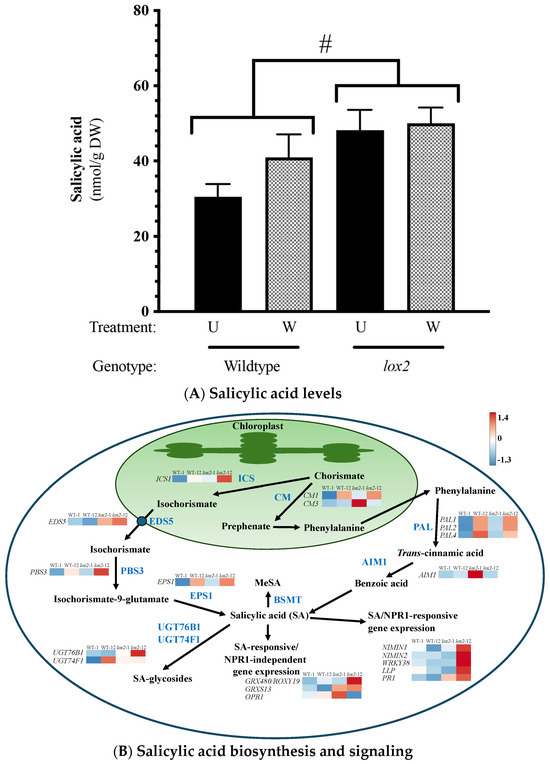 Foliar salicylic acid (SA) levels and SA-related gene expression. Four-week-old Arabidopsis thaliana wildtype (WT) or lox2 plants were left undamaged (U) or wounded (W) with a hole punch on each fully expanded rosette leaf and harvested 1 or 12 h post-damage. (A): Foliar salicylic acid (SA) levels. (B): Constitutive expression of genes involved in SA biosynthesis and SA-responsive gene expression. Phytohormone levels are represented by the mean ± SE. Differences in phytohormone levels were determined by two-factor analysis of variance (2-factor ANOVA) (factors: genotype, treatment) followed by Tukey HSD (Supplemental Table S2). A hashtag (#) indicates genotype differences. Heatmaps visualize constitutive gene expression (wildtype—1 h (WT-1), wildtype—12 h (WT-12), lox2—1 h (lox2-1), lox2—12 h (lox2-12)). Genes: ICS1/SID2/EDS16 (At1g74710), EDS5 (At4g39030), PBS3 (At5g13320), EPS1 (At5g67160), CM1 (At3g29200), CM3 (At1g69370), PAL1 (At2g37040), PAL2 (At3g53260), PAL4 (At3g10340), AIM1 (At4g29010), NIMIN1 (At1g02450), NIMIN2 (At3g25882), WRKY38 (At5g22570), LLP (At5g03350), PR1 (At2g14610), GRX480/ROXY19 (At1g28480), GRXS13 (At1g03850), OPR1 (At1g76680), UGT74F1 (At2g43840), UGT76B1 (At3g11340), BSMT1 (At3g11480).