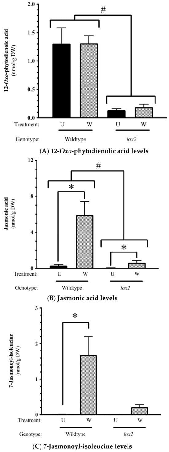 LOX2 has been implicated in wound-associated, chloroplastic generation of 1O2 [34,35]. Comparing transcript expression of 66 1O2-responsive genes in our damaged foliar tissues 1 h post-wounding [72,73], a genotype-difference in wound-induced 1O2-responsive transcript expression was not observed (Supplemental Figure S2).