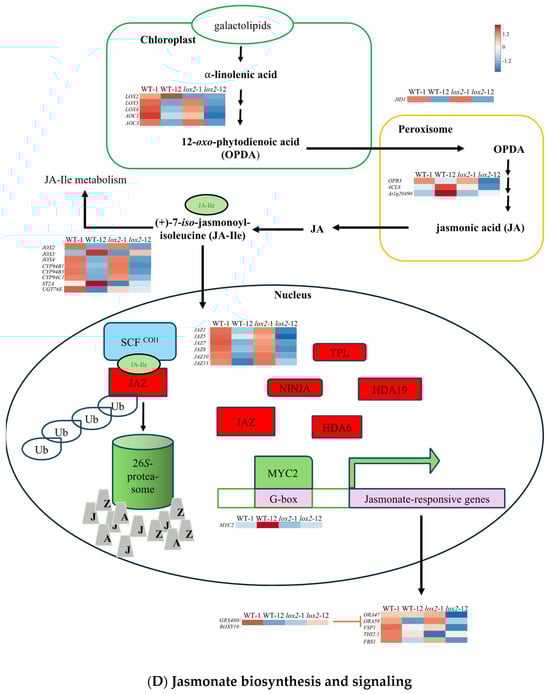 After wounding, the levels of JA and JA-Ile rose in damaged rosette leaves in both or only WT genotypes, respectively (Figure 3B,C). As expected, levels of these phytohormones were ~7.5 times higher in WT than the lox2 mutant. Jasmonate signaling is dynamic with the early expression of genes encoding biosynthetic enzymes and positive regulators (Figure 3D) [39,40,41]. In addition, the jasmonate burst is tempered either by catabolizing jasmonates to a less active form or by the activity of JAZ proteins that bind to and repress MYC2/3/4 transcription factors [42,43].