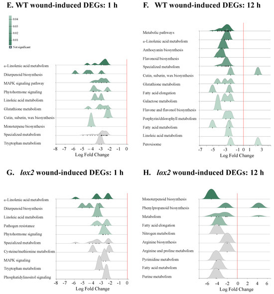 Wound-induced foliar gene expression. Four-week-old Arabidopsis thaliana wildtype (WT) or lox2 plants were wounded with a hole punch on each fully expanded rosette leaf and harvested at 1 and 12 h. Gene set enrichment analyses (GSEA) and ridgeline plots of WT (1 h) (A,E), WT (12 h) (B,F), lox2 (1 h) (C,G) and lox2 (12 h) (D,H). Wound-induced differentially expressed genes (DEGs) were determined by DESeq2 (p-value (padj) ≤ 0.05 and log2 fold change ≥2 or ≤−2). The ridgeline plot visualizes the distribution of differential enrichment categories identified by GSEA. Significantly differentially expressed pathways in ridgeline plots are indicated in green.
