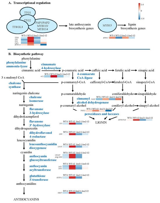 Wound-induced genes involved in polyphenol biosynthesis. Four-week-old Arabidopsis thaliana wildtype (WT) or lox2 plants were wounded with a hole punch on each fully expanded rosette leaf and harvested at 1 or 12 h. (A) Transcriptional regulators and (B) biosynthetic genes. Wound-induced genes were determined by DESeq2 (p-value (padj) ≤ 0.05 and log2 fold change ≥2 or ≤−2). Heatmaps visualize wound-induced gene expression (wildtype—1 h (WT-1), wildtype—12 h (WT-12), lox2—1 h (lox2-1), lox2—12 h (lox2-12)). Genes: TTG2 (At2g37260), TT8 (At4g09820), GL3 (At5g41315), PAP1 (At1g56650), MYB113 (At1g66379), 4CL (At1g20490), TT7 (At5g07990), DFR (At5g42800), LDOX (At4g22880), UF3GT (At5g54060), At4g14090, 3AT1 (At1g03840), 3AT2 (At1g03495), GSTF12 (At5g17220), 5MAT (At3g29590), MYB15 (At3g23250), CAD8 (At4g37990), PRX52 (At5g05340), SST/SCPL9 (At2g23010).