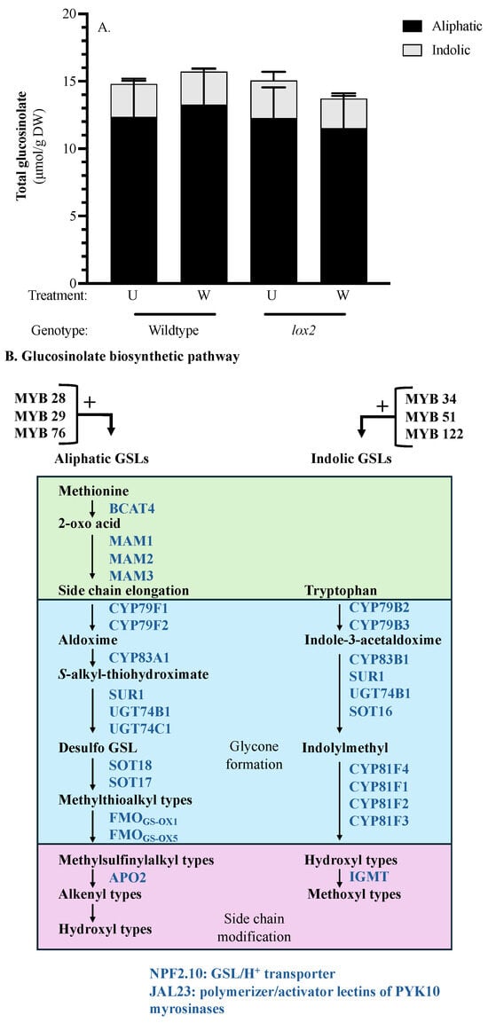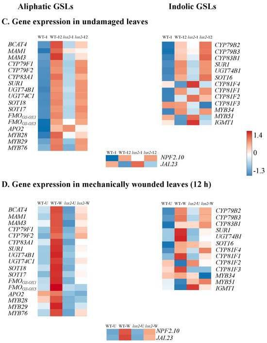 Foliar glucosinolate (GSL) levels and expression of GSL biosynthesis genes. Four-week-old Arabidopsis thaliana wildtype (WT) or lox2 plants were wounded with a hole punch on each fully expanded rosette leaf and harvested at 1 and 12 h. (A) Foliar aliphatic and indolic GSL levels in undamaged (U) and wounded (W) WT and lox2 plants taken 12 h after mechanical damage. (B) GSL pathway illustrating transcriptional activators, biosynthetic enzymes and other GSL-related proteins. Gene expression in (C) undamaged and (D) mechanically damaged arabidopsis rosettes. Glucosinolate levels are represented by the mean ± SE. Differences in GSL levels were determined by a two-factor analysis of variance (2-factor ANOVA) (factors: genotype (WT or lox2), treatment) followed by Tukey HSD (Supplemental Table S3). Heatmaps visualize gene expression (for C: wildtype—1 h (WT-1), wildtype—12 h (WT-12), lox2—1 h (lox2-1), lox2—12 h (lox2-12); for D: wildtype undamaged—WT-U, wildtype wounded—WT-W, lox2 undamaged—lox2-U, lox2 wounded—lox2-W)). Genes: BCAT4 (At3g19710), MAM1 (At5g23010), MAM3 (At5g23020), CYP79F1 (At1g16410), CYP79F2 (At1g16400), CYP83A1 (At4g13770), SUR1 (At2g20610), UGT74B1 (At1g24100), UGT14C1 (At2g31790), SOT18 (At1g74090), SOT17 (At1g18590), FMOGS-OX1 (At1g65860), FMOGS-OX5 (At1g12140), APO2 (At5g57930), MYB28 (At5g61420), MYB29 (At5g07690), MYB76 (At5g07700), NPF2.10 (At3g47960), JAL23 (At2g39330), CYP79B2 (At4g39950), CYP79B3 (At2g22330), CYP83B1 (At4g31500), UGT74B1 (At1g24100), SOT16 (At1g74100), CYP81F4 (At4g37410), CYP81F1 (At4g37430), CYP81F2 (At5g57220), CYP81F3 (At4g37400), IGMT1 (At1g21100), MYB34 (At5g60890), MYB51 (At1g18570).