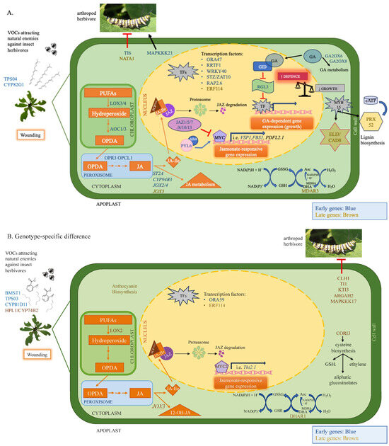 In line with this, jasmonate-responsive genes were among the early responding genes including those that encode enzymes in volatile biosynthesis (i.e., AtTPS04/GES, AtCYP82G1 [49,50]), enzymes involved in sealing damaged tissue (i.e., AtPP2-A5 [51]), transcription factors (i.e., AtRRTF1, AtWRKY40, AtRAP2.6 [52,53,54,55,56]) and proteins involved in plant defense against pathogens or insects (i.e., AtTI6, AtMAPKKK21 [57,58]).