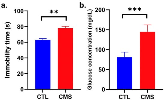 Effect of chronic variable mild stress on (a) immobility time in a forced swimming test; (b) fasting glucose levels. Data are expressed as means ± standard deviation (n = 10). A Student’s t-test was used. *** p ≤ 0.001, ** p ≤ 0.01 compared to the control group. CTL, control group; CMS, chronic variable mild stress group.