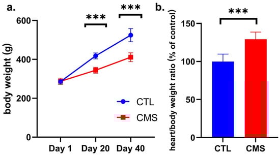 A Student’s t-test showed significantly lower mean body weight in the CMS group on the 20th [p ≤ 0.001; t = 10.83 (18)] and 40th [p ≤ 0.001; t = 8.788 (18)] day as compared to the CTL group (Figure 2a). The heart/total body weight ratio on the 40th day of the experiment was significantly higher (p ≤ 0.001; t = 7.363 (12)] (Figure 2b).
