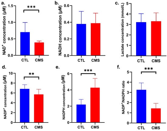 Effect of CVS procedure on biochemical parameters: (a) NAD+; (b) NADH; (c) lactate; (d) NADP+; (e) NADPH concentrations; (f) NADP+-to-NADPH ratio. Data are expressed as means ± standard deviation (n = 10). ** p ≤ 0.01; *** p ≤ 0.001 compared to the control group. CTL, control group; CMS, chronic variable mild stress group.
