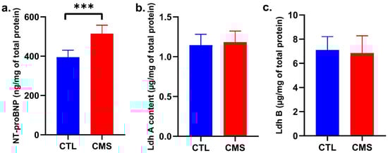 Effect of procedure on biochemical parameters: (a) NT-proBNP; (b) Ldh A; (c) Ldh B content. Data are expressed as means ± standard deviation (n = 10). *** p ≤ 0.001 compared to the control group. CTL, control group; CMS, chronic variable mild stress group.