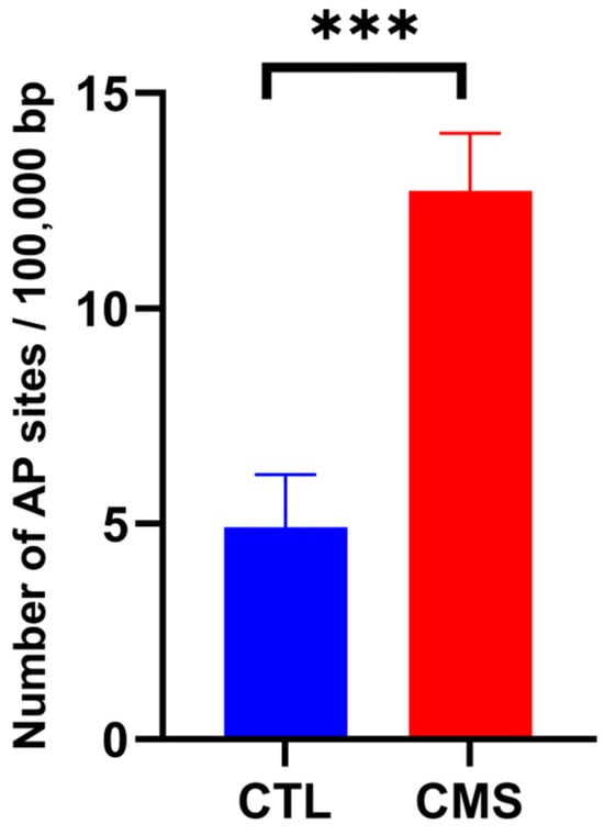 Effect of chronic variable mild stress on a number of abasic sites per 100,000 bp in DNA of rats subjected to the procedure. Data are expressed as means ± standard deviation (n = 10). A Student’s t-test was used. *** p ≤ 0.001 compared to the control group. CTL, control group; CMS, chronic variable mild stress group.