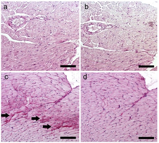 Section of rat heart muscle. H + E staining. Magnification ×150 (scale bar: 150 μm). (a) Normal histopathology picture of the rat heart in the CTL group; (b,c) wavy course of fibers (→) indicating necrosis in the CMS group; (d) mononuclear cell infiltration (→) and increased acidophilus of individual cardiomyocytes (→) in the CMS group. CTL, control group; CMS, study group.
