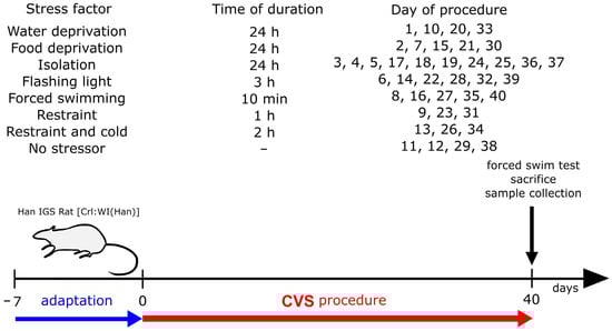 After seven days of acclimatization, the animals were randomly divided into the control group (CTL) and rats subjected to CVS procedures (CMS, to distinguish the group name from the procedure name). Each group consisted of 10 individuals. CTL rats were kept free without being subjected to any procedures, while rats in the CMS group were exposed to various stress conditions for 40 days []. The following stressors were used in the experiment: 24 h of food or water restriction, 1 hour of immobilization in a sealed plastic tube (26 × 6 cm), 2 h restraint at 4 °C, forced swimming for 10 min, blinker for 3 h (rats were placed in open-field container made of brown plywood with a glass front wall; a 40 W flash with 60 flashes per minute was used) and 24-hour-isolation (Figure 9).