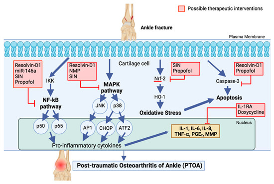Possible Underlying Mechanisms of Inflammation Leading to Development of PTOA After Ankle Fracture, and Therapeutic Approaches. The intricate signaling cascades are implicated in the initiation and progression of inflammatory responses after ankle fractures, along with plausible therapeutic agents that can be employed to attenuate inflammation. Resolvin D1 (RvD1) exhibits promising inhibitory properties towards Nf-kB, MAPK, and apoptotic pathways by impeding caspase-1 and caspase-3 activation. Similarly, SIN impedes Nf-kB, MAPK pathways, and oxidative stress through the activation of Nrf-2. NMP selectively hampers the MAPK pathway, while miR-146a specifically targets the Nf-kB pathway. Propofol manifests potential inhibitory effects on Nf-kB, oxidative stress, and apoptotic pathways. Notably, IL-1RA and doxycycline represent alternative inhibitors that have the potential to mitigate the levels of pro-inflammatory cytokines.