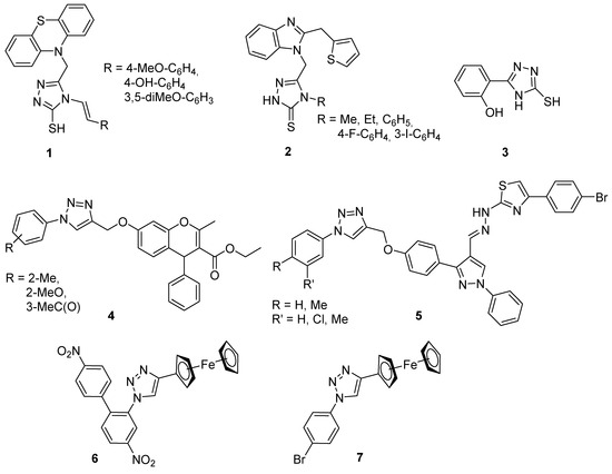 Structures of selected 1,2,4- and 1,2,3-triazole-containing compounds 1–7 with antioxidant activity.