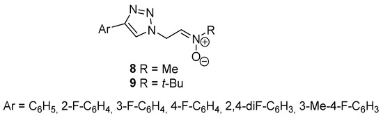 Recently, we have investigated the antioxidant capacity of N-[2-(4-aryl-1H-1,2,3-triazol-1-yl)ethylidene]methanamine oxides 8 and N-[2-(4-aryl-1H-1,2,3-triazol-1-yl)ethylidene]-2-methylpropan-2-amine oxides 9 (Figure 2) [16]. Among all the tested nitrones, N-tert-butyl derivatives 9 (Figure 2) having the 4-fluorophenyl, 2,4-difluorophenyl, and 4-fluoro-3-methylphenyl substituents at C4 in 1,2,3-triazole moiety appeared the most potent hydroxyl radical scavengers (~100%), more potent than Trolox (88%), used as a reference compound. Moreover, N-{2-[4-(4-fluoro-3-methylphenyl)-1H-1,2,3-triazol-1-yl]ethylidene}-2-methylpropan-2-amine oxide 9 (R = t-Bu, Ar = 3-Me-4-F-C6H3) (Figure 2) was identified as the most balanced and potent antioxidant agent, since it was an extremely efficient and potent hydroxyl radical scavenger, the most potent 5-lipoxygenase (LOX) inhibitor, and one of the most potent lipid peroxidation inhibitors (LPis) and 2,2′-azino-bis(3-ethylbenzothiazoline-6-sulfonate) radical cation (ABTS•+) scavenger of the whole series of the tested nitrones.