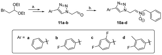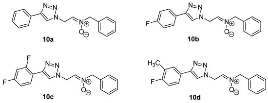 In continuation to our studies to identify new nitrones for the therapy for pathological inflammation and oxidative stress (OS), the nitrones 10a–d (Figure 3), N-benzyl analogs of the previously reported compounds 8 and 9 [16] (Figure 2), have been synthesized with the intention of testing their antioxidant potency. The newly prepared series of compounds contains unfunctionalized nitrone 10a as well as derivatives substituted at the C4 of 1,2,3-triazole moiety with 4-fluorophenyl (10b), 2,4-difluorophenyl (10c), and 4-fluoro-3-methylphenyl (10d), which were selected from the previously synthesized nitrones of series 8 and 9 [16] based on their observed antioxidant activity.