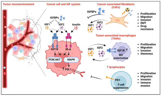 Cancer cells act in a complex tumor-specific microenvironment, which includes immune and stromal cells, nutrients, and extracellular vesicles, and shapes tumor cell behavior [38,40,71]. This section will highlight the critical extracellular interactors of the IGF system, defining the impact on tumor malignancy as well as the response to anti-IGF therapies.