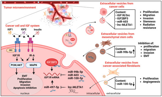 A consistent body of evidence demonstrates that extracellular vesicles can transfer post-transcriptional regulators of the IGF axis, including miRs, lncRNAs, and RNA-binding proteins, thereby affecting IGF expression and functions in recipient cells with an impact on different hallmarks of cancer [99,100,101,102,103]. Of note, extracellular vesicles containing IGF component regulators can be produced either by cancer cells or by normal cells surrounding the tumor.