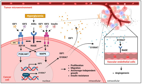 Schematic representation of the functional crosstalk between the IGF system and the Receptor for Advanced Glycation End Products (RAGE). In cancer cells, IGF1R and IR-A display high or low affinity for the ligands. Hyperglycemia favors the generation of AGE products, which activate RAGE. RAGE interacts with IGF1R and IR-A, modulating the activation of the PI3K/AKT/MAPK pathways and sustaining the transcription of IGF1 and the RAGE ligand S100A7. S100A7 additionally interacts with RAGE in vascular endothelial cells, sustaining angiogenesis. Biological responses critical for cancer development and progression and functionally associated with the depicted interactions are reported.