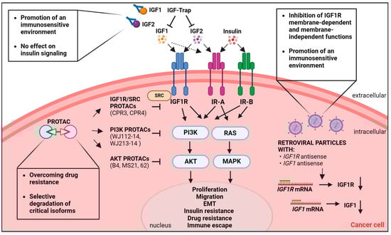 Schematic representation of emerging therapeutic strategies targeting the IGF system. In the extracellular compartment, IGF1, IGF2, and insulin bind their cognate receptors IGF1R, IR-A, and IR-B with different affinities. Receptor activation causes the activation of the downstream PI3K/AKT and RAS/MAPK pathways. Biological responses elicited by an active IGF system and critical for cancer development and progression are reported. The IGF-Trap binds to IGF1 and IGF2 but not insulin and blocks IGF1/IGF2 binding to the receptors. In the cytoplasm, different proteolysis-targeting chimeras (PROTACs) induce the degradation of various proteins of interest: 1. IGF1R and its interactor SRC; 2. PI3Kα and PI3Kβ isoforms of PI3K; 3. AKT. Transduction of retroviral particles containing IGF1R or IGF1 antisense oligos blocks IGF1R and IGF1 expression. The major advantages of the depicted therapeutic approaches are reported in boxes.