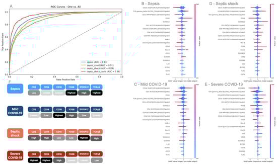 XGBoost classification and SHAP analysis of genes responsible for characterizing sepsis, septic shock, and moderate and severe COVID-19. In (A), we show the Area Under the Curve (AUC) score of an XGBoost multiclass classifier whose input is the expression level of immunological cells expressing 20 genes (i.e., FOSB, IGLC3, S100A9, S100A10, CD56, IFITM3, CD52, IL32, CD74, S100A12, HLA-A, CD24, CD8, CD14, CD19, TCRɣδ, CD3, TLR2, CD16, and CD4) mapped to a disease model (i.e., sepsis, septic shock, moderate COVID-19, and severe COVID-19). In (B–E), we show the SHAP explanation for each input gene in classifying sepsis, mild COVID-19, septic shock, and severe COVID-19. The results displayed in the SHAP plots consist of an input gene (left y-axis) as per the feature importance for a particular class, the expression of the gene (right y-axis), and how this level of expression contributed to assigning a SHAP value (x-axis). Expression levels whose SHAP value is positive are significant descriptors of a class (i.e., disease model). Finally, in (F), we quantified the raw expression value of a subset containing the first five genes that best described each class.
