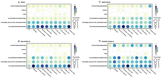 We performed a differential expression analysis to check the level of each transcript according to the cell type it came from across sepsis, mild COVID-19, septic shock, and severe COVID-19 patients. We limited the analysis to the six genes that were listed as important descriptors of each medical condition, i.e., CD3, S100A12, FOSB, CD14, TCRɣδ, and CD16. The results show important signals that differentiate sepsis (Figure 2A), mild COVID-19 (Figure 2B), septic shock (Figure 2C), and severe COVID-19 (Figure 2D). First, the CD16 gene is shown to express higher in sepsis and mild COVID-19 patients, particularly across dendritic and ɣδ T cells. The same profile of CD16 expression was found to be lower in the same cell types across severe manifestations of septic shock and severe COVID-19, suggesting CD16 as a marker gene for severity. Moreover, the transcript CD3 was shown to represent a higher expression normalized value in septic shock, particularly when subgrouping ɣδ T cells. This transcript was also upregulated by CD4 memory T cells, dendritic cells, and ɣδ T cells in severe COVID-19 patients, while CD3 showed a lower expression rate across all cell types in sepsis and mild COVID-19 patients. S100A12 has shown very low expression in mild COVID-19 patients and no expression in severe COVID-19 patients, particularly when subgrouping differences across CD8 memory T cells and ɣδ T cells, meaning it could be a representative target in viral-induced diseases. Interestingly, in the case of septic shock patients, S100A12 served as a relevant gene target when analyzing monocyte non-classical cells. Another result worth mentioning is the clear upregulation of TCRɣδ in severe COVID-19 patients, particularly when looking at differences in dendritic cells compared to mild COVID-19 and bacterial-induced sepsis, making it a potential classifier in critically ill COVID-19 patients.