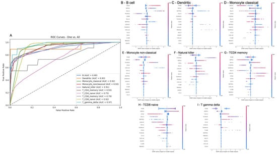 XGBoost classification of cell types and the interpretation of the classifier. In (A), we show the AUC plots of an XGBoost multiclass classifier using the transcripts of single cells to classify their corresponding type in a one-versus-all approach. The classes with an AUC equal to or higher than 0.8 were selected to have their model interpreted. In (B–I), we show the contribution of input features (i.e., transcripts) was accounted for by the assignment of B cell, dendritic, monocyte classical, monocyte nonclassical, natural killer, TCD4 memory, TCD8 naïve, and T gamma delta, respectively.