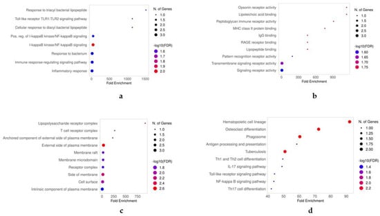 Gene ontology analysis of the genes CD3, S100A12, FOSB, CD14, and CD16. In (a), we show the biological processes mapped to the candidate genes. In (b), we show the molecular functions. The cellular components and enriched KEGG pathways are shown in (c,d), respectively. The results of the GO analysis are presented in the dot plots, and the GO terms were shortlisted based on the FDR values.