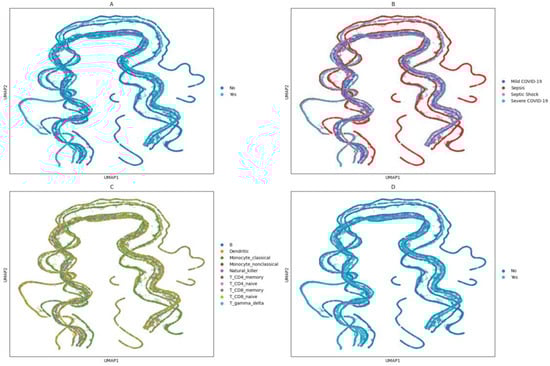UMAP plots. A total of 19,002 cells from sepsis patients, 6268 cells from mild COVID-19 patients, 4276 cells from severe COVID-19 patients, and 8186 cells from septic shock patients expressing twenty immunologically associated gene transcripts (i.e., FOSB, IGLC3, S100A9, S100A10, CD56, IFITM3, CD52, IL32, CD74, S100A12, HLA-A, CD24, CD8, CD14, CD19, TCRɣδ, CD3, TLR2, CD16, and CD4) were mapped and shown in a two-dimensional plot. We separated different clinical information to elicit differentiated behavior in cells expressing transcripts, as seen in (A), which shows the cells under different medical conditions. (B) shows the cell types separated. (C) indicates whether the cell originated from a mild or severe patient. (D) conveys whether the patient’s infection is of a viral (mild and severe COVID-19) or non-viral (sepsis and septic shock) nature.
